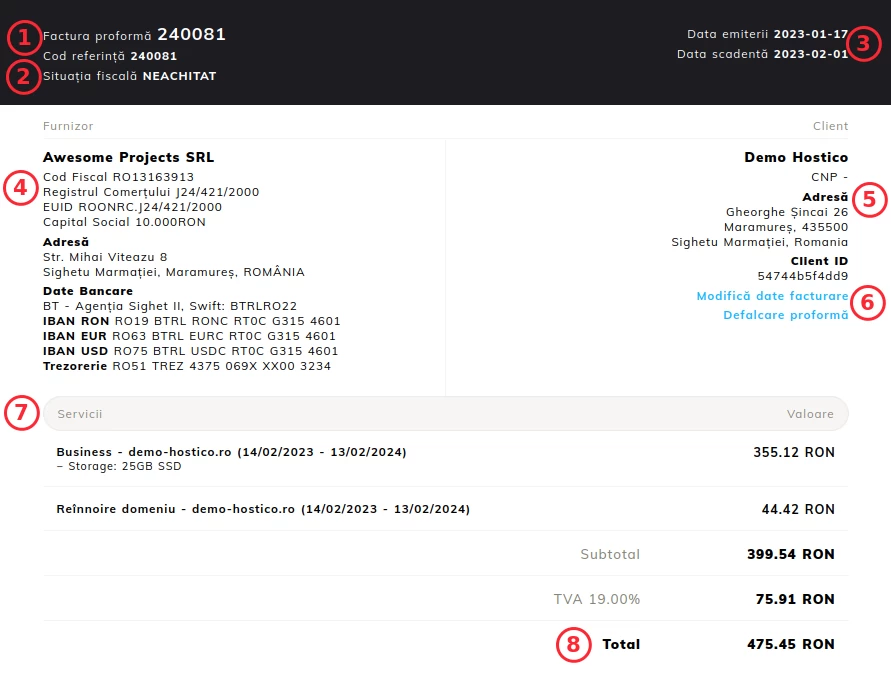 3. Date - represents the day the proforma invoice is issued and the day until which it can be paid to avoid interruptions of the services on the invoice;