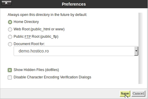 • In the window that will appear, we will ensure that the Show Hidden Files (dotfiles) option is checked, after which we will click the Save button.